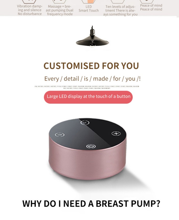 Chúng tôi là nhà sản xuất chuyên nghiệp chuyên về các thiết bị nhỏ dành cho bà mẹ và trẻ sơ sinh. Chúng tôi cam kết thiết kế, phát triển và sản xuất nhiều loại thiết bị an toàn và đáng tin cậy dành cho bà mẹ và trẻ sơ sinh. Máy hút sữa điện một mặt tròn nhỏ này có ba chế độ: massage, bơm và sinh học. Nó giải quyết những khó khăn khi cho con bú ở các bà mẹ sau sinh và có thể chuyển đổi giữa chế độ một mặt và hai mặt để cải thiện hiệu quả hút sữa.